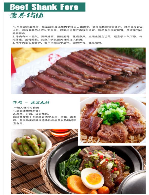 牛大腿上的肌腱上的一条更为纤细的肌腱,因为里面的经络比较多,切片炒起来的时候自然的卷起来,爽脆可口,所以一般食家都叫它金钱腱。牛腱肉即前后腿肉。前腿肉称前腱,后腿肉称后腱,我们供应的是前键。筋肉相同呈花形。适于炖、焖、酱等。 牛肉是中国人的第二大肉类食品,仅次于猪肉,牛肉蛋白质含量高,而脂肪含量低,所以味道鲜美,受人喜爱,享有“肉中骄子”的美称。牛腿肉脂肪的含量极少,如果将其周围的脂肪削除掉,脂肪的含量便比腓力肉还少。